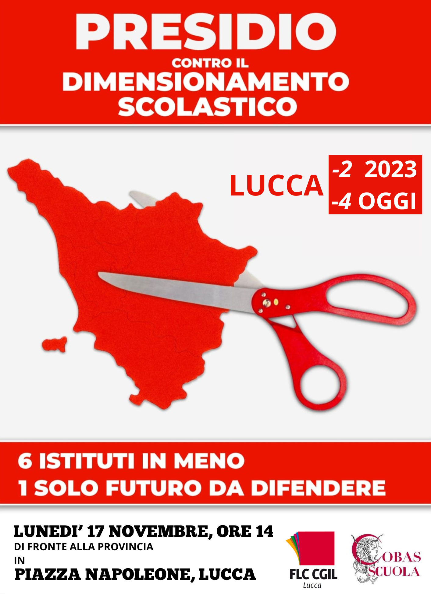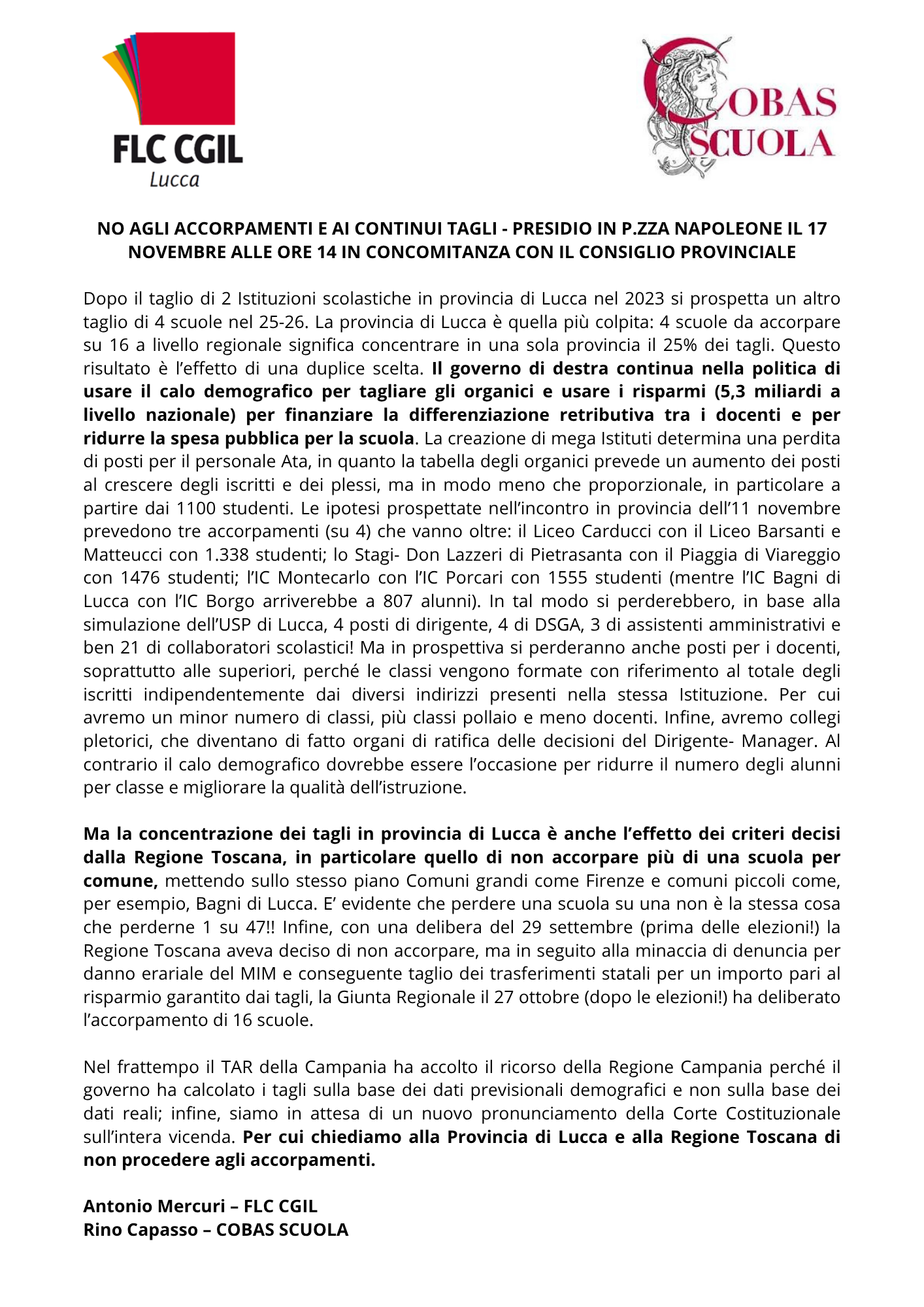 FL CGIL LUCCA: Comunicato stampa e volantino presidio 17 novembre contro accorpamento scuole.