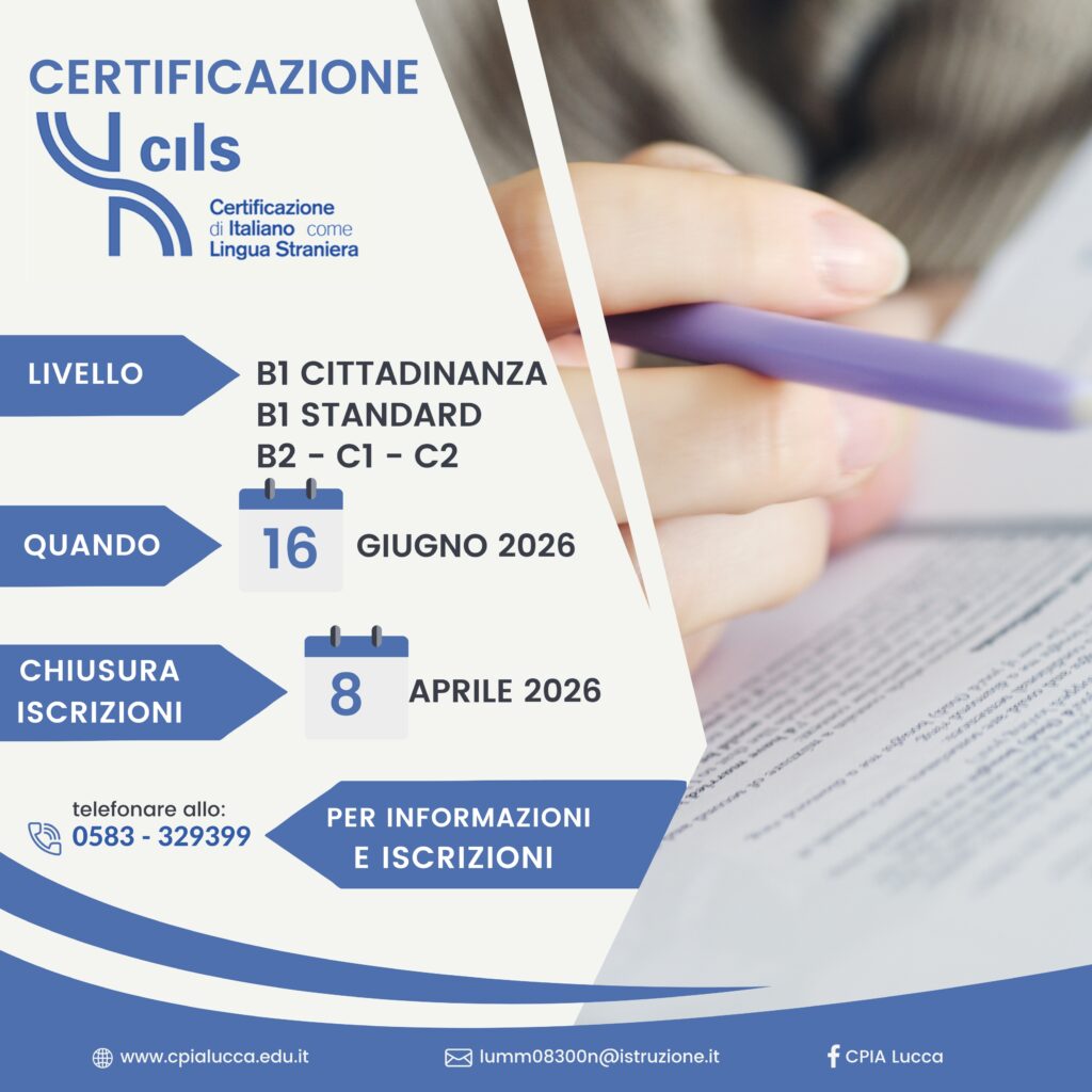 Il CPIA Lucca è ENTE ACCREDITATO dall’Università per Stranieri di Siena per lo svolgimento degli ESAMI CILS di Certificazione dell’Italiano come Lingua Straniera. . Per sostenere gli esami di Certificazione CILS non è necessario avere titoli di studio particolari, ma solo una conoscenza della lingua italiana corrispondente ai parametri indicati per ciascun livello CILS. .